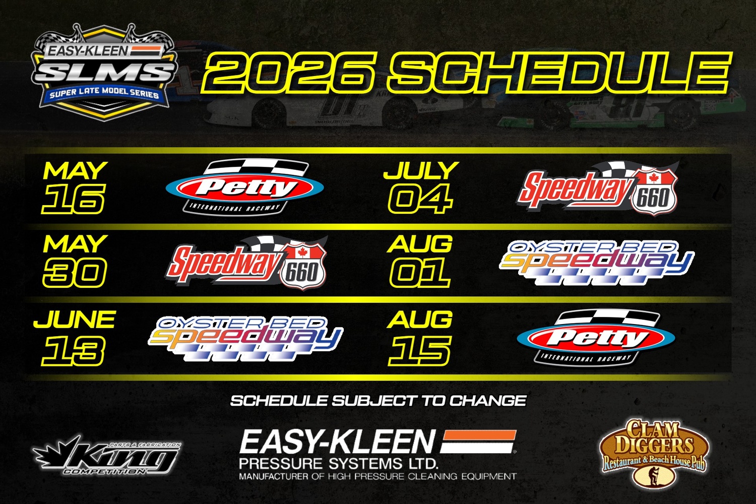 (November 20th, 2025) – Management of the Easy-Kleen Super Late Model Series is thrilled to continue building momentum and excitement by officially unveiling the six-race schedule lined up for the 2026 season.